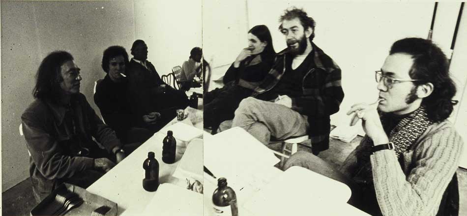 Michael Snow screens his 16mm films—including BACK AND FORTH (1969), SIDE SEAT PAINTINGS SLIDES SOUND FILM (1970), and STANDARD TIME (1967)—at Buffalo State College, followed by dinner and conversation with artists at Hallwalls. Photo (left–right): Michael Snow (with long hair), Paul Sharits (with cigarette), Jack Griffis, Unknown, Jeff Catalano, Hollis Frampton, and London filmmaker and critic Peter Gidal.