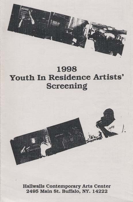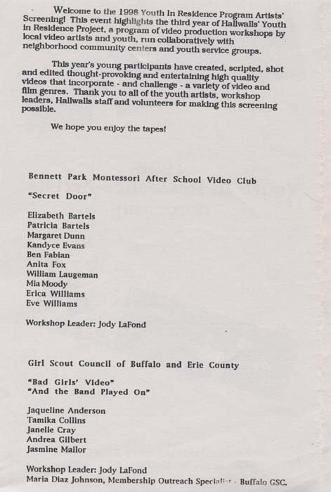 Hallwalls' 3rd Annual Youth-in-Residence screening featuring collaborative projects with youths from the National Inner City Youth Organization, the Girl Scout Council, PS3 After-School Video Club, Bennett Park Montessori After-School Video Club. Instructors include Jorge Fiedler, Jody Lafond, Robin Smith and Dwaine Terry. SECRET DOOR (Bennett Park Montessori After School Video Club: Elizabeth Bartels, Patricial Bartels, Margaret Dunn, Kandyce Evans, Ben Fabian, Anita Fox, William Laugeman, Mia Moody, Erica Williams, Eve Williams. Jody Lafond, workshop leader); BAD GIRLS VIDEO and AND THE BAND PLAYED ON (Girl Scout Council of Buffalo and Erie County: Jaqueline Anderson, Tamika Collins, Janelle Cray, Andrea Gilbert, Jasmine Mailor. Jody Lafond, workshop leader; Maria Diaz Johnson, Membership Outreach Specialist-Buffalo GSC); EXPRESSIONS OF YOUTH (National Inner City Youth Organization: Duane Blutt, Elizah Davis, Richard Gray, Stacy Grayson, Triston Hall, Curtis Mortis, Marcus Moses, Rodney Singleterry, Kyris Small, Michael Washington. Dwaine Terry, workshop leader; Tara Lisoy, Hallwalls intern; Joyce Wilson Nixon, Director NICYO; Tracy Pawarski, Chair of Programming); MELTDOWN IN THE HOOD (The PS-3 After School Video Club: Davonna Abrams, Corrie Allen, Remington Brundige, Khyler Campbell, Josue Colon, Noel Gonzales, Albert Gulledge, Zipporah Jones, Latisha Lane, Adam Schmidt, Nathalie Vierira, Terrance Williams, Rashimee Wilson. Jorge Fiedler, workshop leader; Mark Frazier, Principle; Maxine Hare, Attendance Supervisor; Maria Rosa, Buffalo Public Schools Bilingual Attendace Officer; Pam Orcut, Video Instructor; Anne Marie Tryjankowski, School Coordinator).