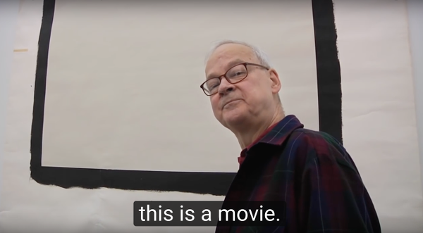If you were watching this, you'd see Tony Conrad looking straight into the camera with an absurd grin on his face as he proudly declares this 2D painting of a square, to be a movie. Obviously he's outsmarted everyone and he knows it and the gleeful joy he feels is contagious. You want to see whatever it is Tony is seeing in this seemingly empty box painted on the canvas, you want to believe in the world he's claiming exists. Because Tony says so, it's no longer a square box painted on the wall, it's a movie screen, and as we speak, the movie is still playing itself out, and yes, he's made a film longer than anything Andy Warhol came up with when he created his 24-hour film. Tony's film could last 50 years.