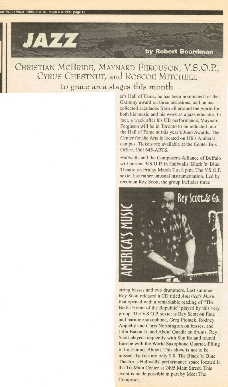 Featuring new works by Rey Scott and Greg Piontek. Led by Rey Scott on flute and baritone saxophone; Greg Piontek, Rodney Appleby and Chris Northington on basses; and John Bacon Jr. and Abdul Qadir on drums.