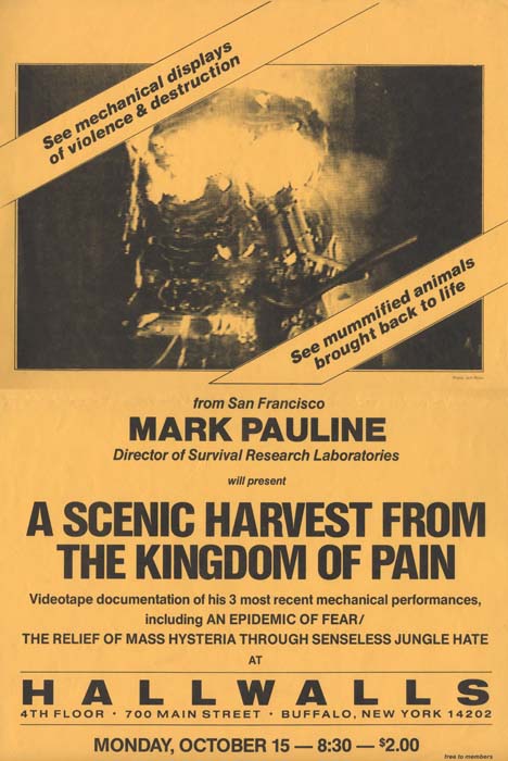 Presents A SCENIC HARVEST FROM THE KINGDOM OF PAIN: a compilation of his human-less performance pieces including his most recent work titled AN EPIDEMIC OF FEAR/THE RELEASE OF MASS HYSTERIA THROUGH SENSELESS JUNGLE HATE.