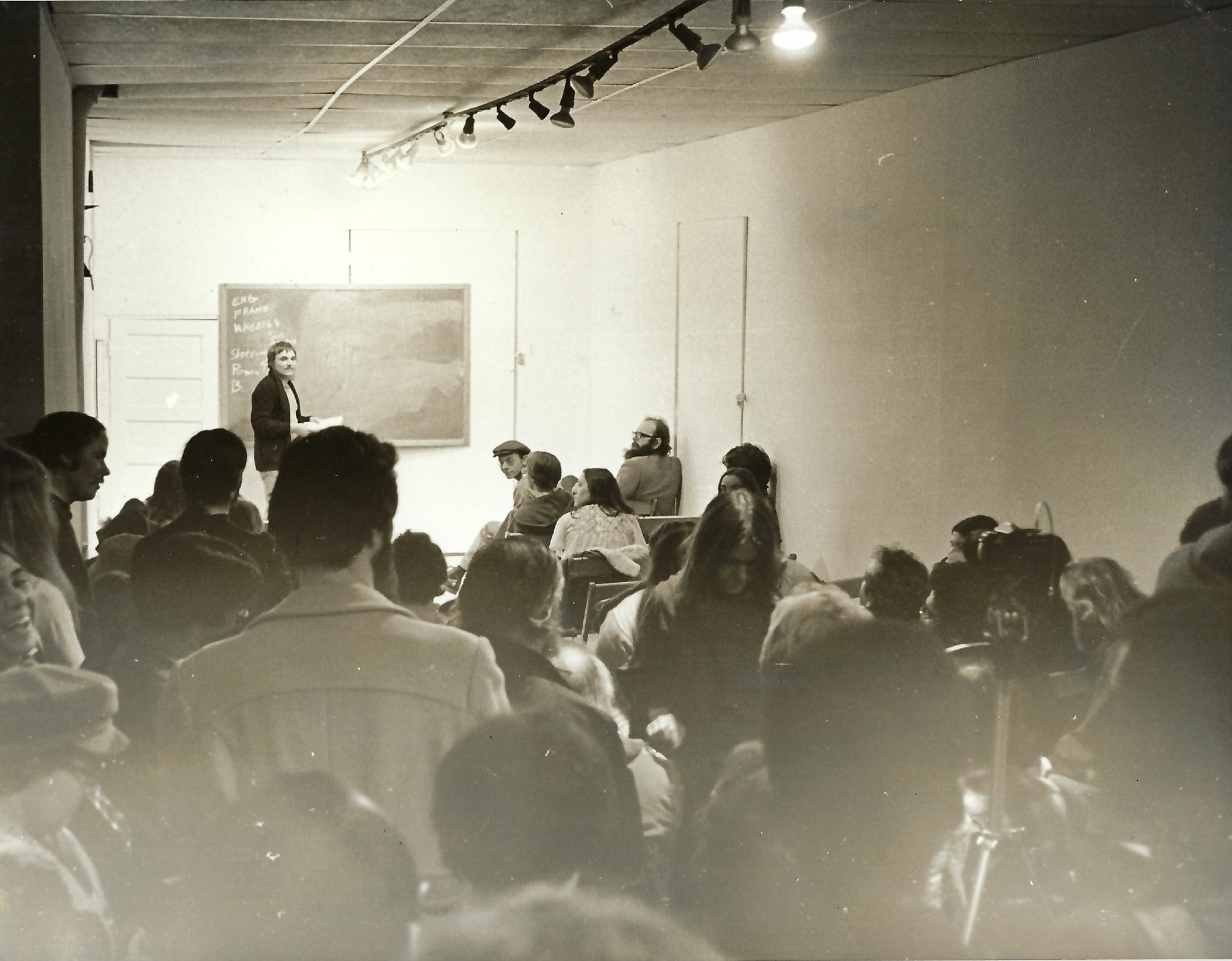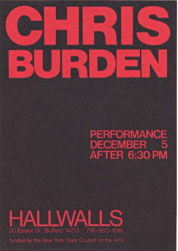 "Yes, Roger, that was on Dec. 5, 1975, within Hallwalls' first 12 months. As much as this performance might've been relatively understated (unspectacular) and even boring, documentation was nonetheless included in Chris Burden's 'first U.S. museum survey' that Cheryl & I saw at the ICA Boston in 1989 at its former location in the former police HQ on Boylston Street. The documentation consisted of a piece of chalk on a vitrine-topped pedestal. Elsewhere in that retrospective was the film documentation of Burden's first 'Beam Drop,' at Artpark, Lewiston, NY, summer 1984" (Ed Cardoni, reply, 4/13/18).