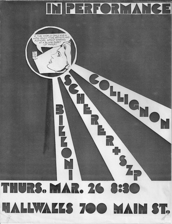 Four local performance artists: Tony Billoni; Bob Collignon; George Scherer; and Brian Szp perform short works.