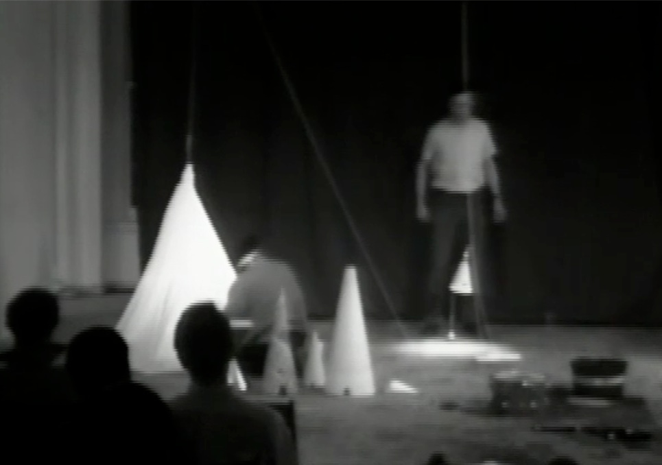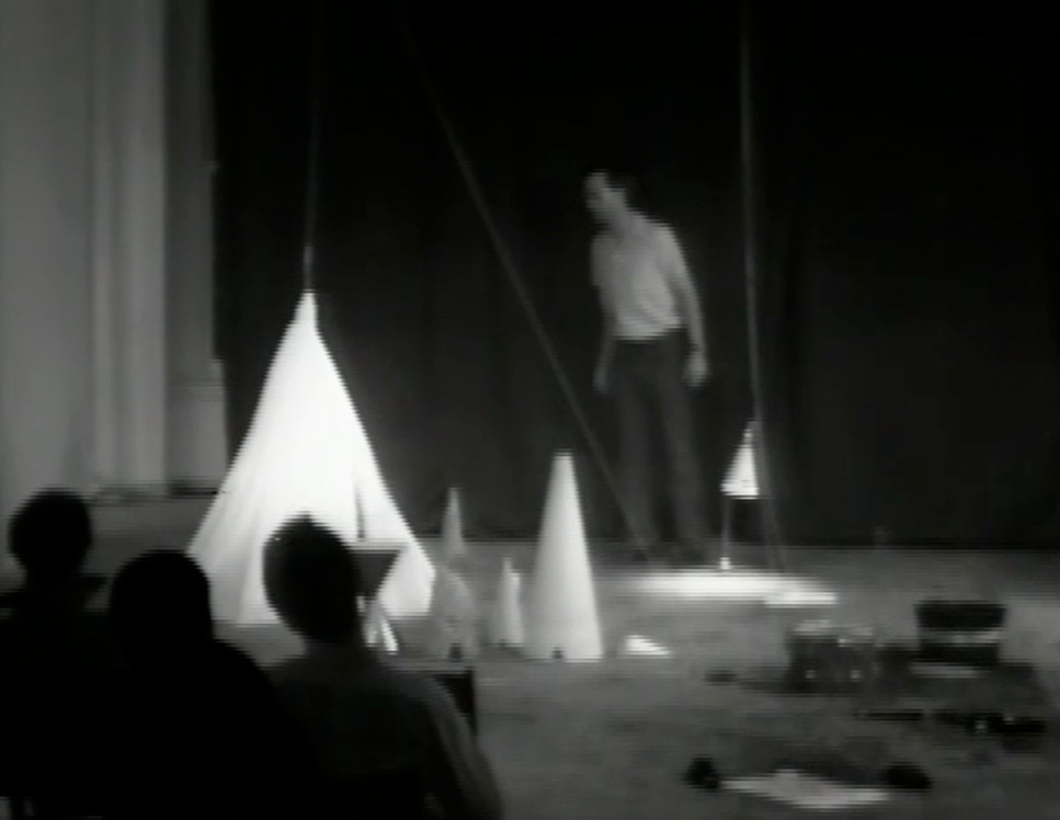 "Unfortunately, many of Mike’s early performances are documented only in photo and script form, if at all. He refused to allow them to be filmed, stating that they should exist only in the moment. As far as I know, there are only two videos of these early pieces: The Monitor and the Merrimac…at Hallwalls in Buffalo, and Plato’s Cave, Rothko’s Chapel, Lincoln’s Profile, 1986, shot at Artists Space in New York, a phenomenal performance he backed musically in collaboration with Sonic Youth. I recently saw the Hallwalls video for the first time and was catapulted back in time to April 30, 1981. Before performing, Mike would hang out in a bathroom, pacing, revving up for the event, running through things in his head, hitting a small whiskey flask, and running cold water into the blocked sink. He would splash his face over and over until his T-shirt was soaked, pull his pants away from his belly and shovel icy water onto his genitals, and, for good measure, dunk his head into the sink with the alarming thud of bone bouncing off porcelain. Then he would slick his hair back and be ready to go, perfectly tuned, clearheaded and in the zone. The poetry would flow, drums would beat, Mike would stomp around with some black plastic sacks attached to his feet, hide in a tent, wear a dunce cap, and lie among some cones as a white cloth rose up and down above his crotch in syncopation with a dim bulb."