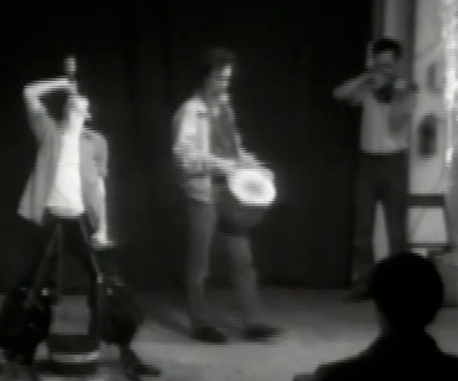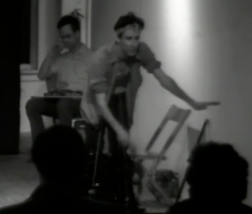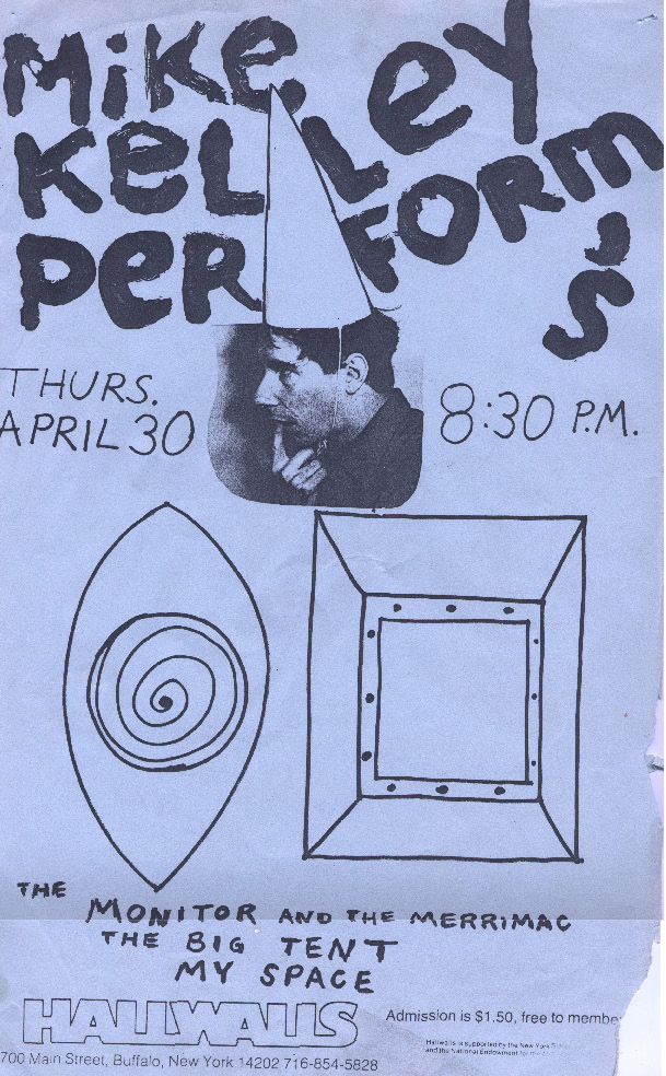 HISTORICAL NOTE: Although not publicized in print in the calendar or on the poster in 1981, our recent first viewing of the restored video documentation of The Monitor and the Merrimac [sic] shows in-person appearances by Mike Kelley's long-time friends and frequent collaborators Tony Oursler (briefly beating a drum in the first of the three performances,The Monitor and the Merrimac) and Tony Conrad, who participates in both of the first two pieces, including playing violin in the first and performing speaking parts in both. Kelley and Oursler were in Buffalo to act in scenes in Conrad's film then in progress, WiP (Women in Prison).