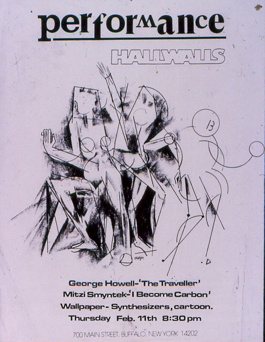 Performances of new work by local artist George Howell (THE TRAVELLER),Mitzi Smyntek (I BECOME CARBON), and Wallpaper (Synthesizers and cartoons) [NOTE: Audio documentation of this event is in Hallwalls archive at the Poetry Collection, a special collection of the State University of New York at Buffalo Libraries.]