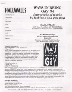 WAYS IN BEING GAY '94 (November 1-December 3, 1994) Hallwalls, Inc. Buffalo, NY, 1994. [A eight-page program for the WIBG series detailing activities associated with "Four Weeks of Works by lesbians and Gay Men" including film, performance, literature, etc. The program features details (ie locations, dates, times, brief descriptions) about the programs organized by Margaret Smith.]