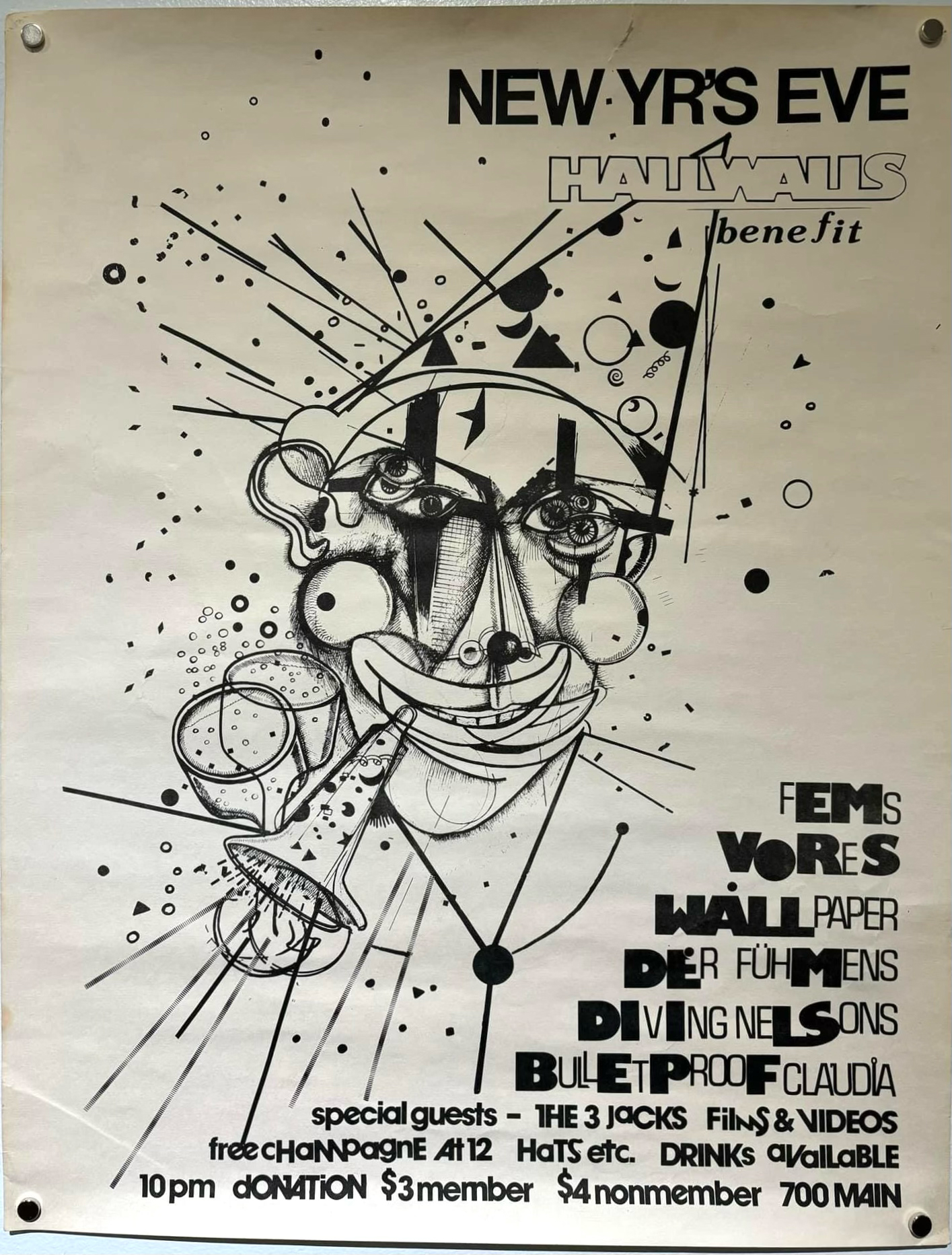 Fundraiser and party at Hallwalls on New Year's Eve with performances by the bands Fems, Vores, Wallpaper, Der Fühmens, Diving Nelsons, & Bulletproof Claudia. Special guests—The 3 Jacks, films & videos, free champagne at 12, hats, etc. 10pm, cash bar, $3 members, $4 nonmembers. 700 Main.