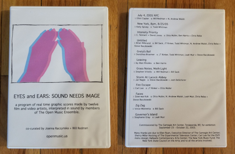 A program from 2008 of real-time graphic scores created by Western New York based film and video artists and sonically interpreted by members of the Open Music Ensemble. Curated by Will Redman and Joanna Raczynska, in collaboration with the Carnegie Art Center, the Experimental Television Center, and Hallwalls Contemporary Art Center.