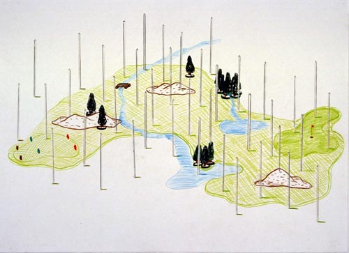 The pencil crayon drawings for Stars & Pars combine art history with popular culture—more specifically, the popular sport of golf is combined with the less popular history of Modern sculpture. Within each drawing, a sculpture by a historically-significant artist is situated within an imaginary golf course landscape in a humorous and ludicrous hybrid. Respect for the integrity and importance of the sculptures—and the lush modernism of imagined greens—is maintained as a new aesthetic terrain is suggested. Included in Goreas' hypothetical Post Modern Sculpture Park are works by Rachel Whiteread, Robert Smithson, Joseph Beuys and Louise Bourgeois.