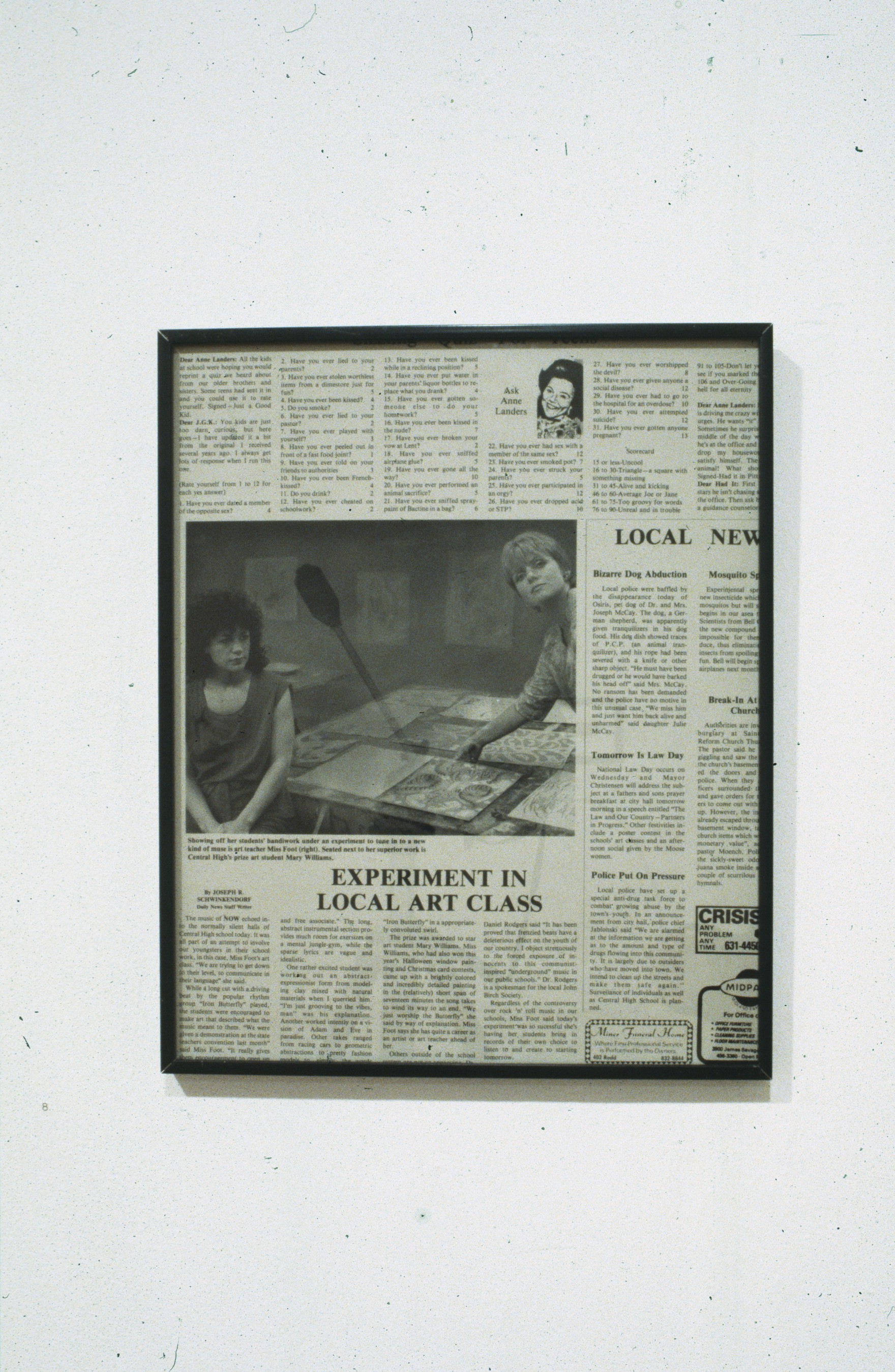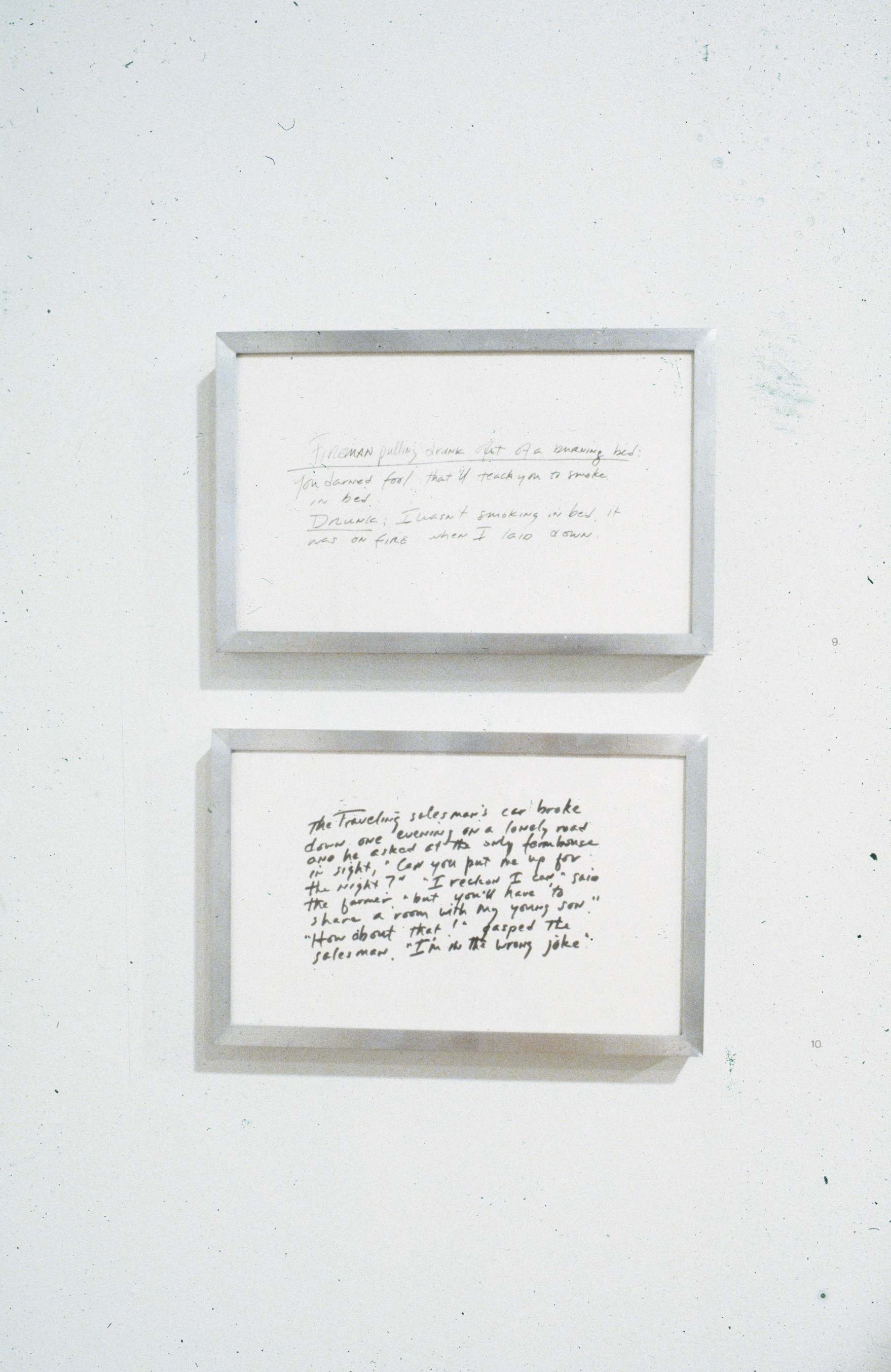 Guest-curated by NYC artist (formerly an art student in Buffalo, and involved with Hallwalls as an artist and curator as far back as 1979), Daniel Levine. Works by artists fascinated by American pop culture and our alienated stammerings (conscious or otherwise). Artists include John Currin, Jessica Diamond, Felix Gonzalez-Torres; John Miller; Cady Noland; Steven Parrino; Raymond Pettibon; Donald Powley; Richard Prince; Al Ruppersberg; Jim Shaw. Exhibit also open on December 31, 1989 for Downtown Buffalo's FIRST NIGHT event.