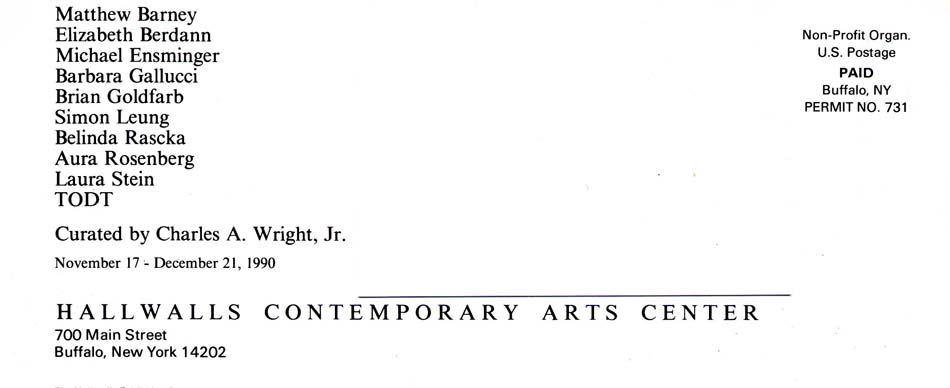 A group exhibition curated by Charles A. Wright. Artists include Matthew Barney, TODT, Aura Rosenberg, Elizabeth Berdann, Torsten Z. Burns, Laura Stein, Barbara Gallucci, Brian Goldfarb, Michael Rees, Simon Leung, Michael Ensminger, and virocode (Andrea Mancuso & Peter D'Auria).