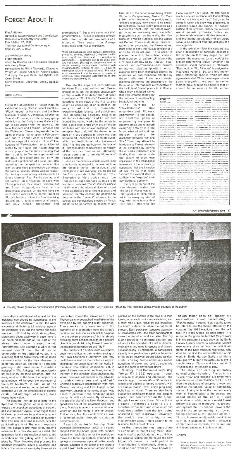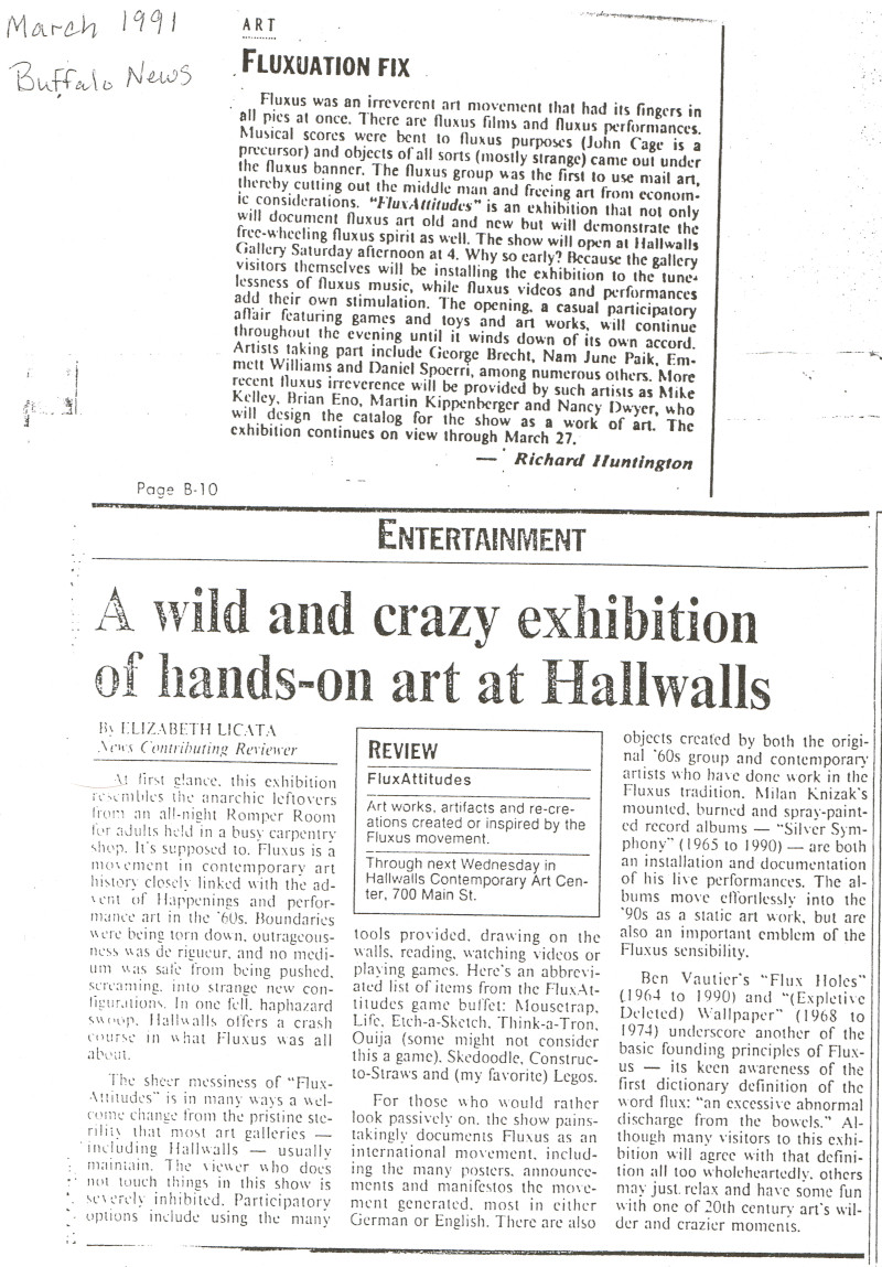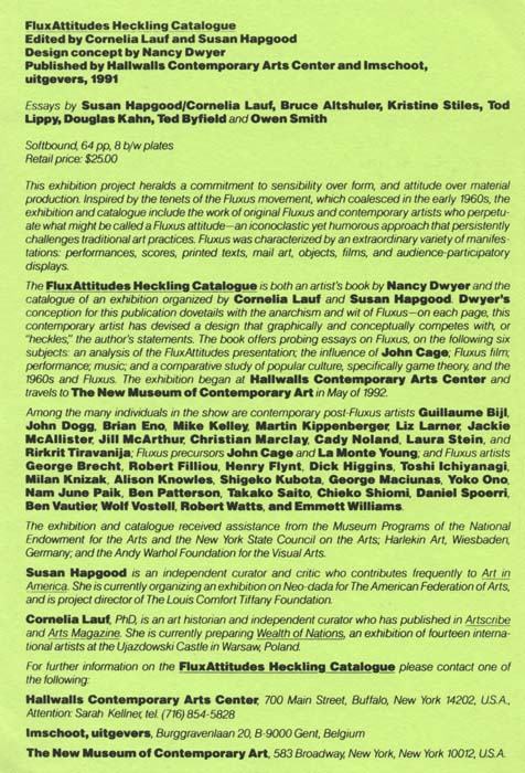 Visual arts exhibition curated by Cornelia Lauf and Susan Hapgood, featuring artists Eric Anderson; Ay-O; Guillaume Bijl; George Brecht; Werner Buttner; Giuseppe Chiari; Philip Corner; Meg Cranston; John Dogg; Nancy Dwyer; Brian Eno; Robert Filliou; Henry Flynt; Ken Friedman; Group Material; Al Hansen; Sohei Hashimoto; Geoff Hendricks; George Herold; Hi Red Center; Dick Higgins; Toshi Ichiyanagi; Joe Jones; Mike Kelley; Martin Kippenberger; Milan Knizak; Alison Knowles; Takehisa Kosugi; Shigeko Kubota; Zini Lardieri; Liz Larner; Gyorgy Ligeti; Jackson Mac Low; George Maciunas; Christian Marclay; Jackie McAllister; Jill McArthur; Larry Miller; Peter Moore; Cady Noland; Yoko Ono; Claes Oldenburg; Nam June Paik; Ben Patterson; Takako Saito; Peter Schmidt; Thomas Schmidt; Carolee Schneemann; Paul Sharits; Chieko (Meiko) Shiomi; Daniel Spoerri; Laura Stein; James Tenney; Rirkrit Tiravanija; Yasunao Tone; Ben Vautier; Wolf Vostell; Yoshimasa Wada; Robert Watts; David Wells, Emmett Williams; and La Monte Young. The exhibit was concieved by artist Rirkrit Tiravanija and is accompanied by a catalogue constructed by Nancy Dwyer. The exhibition went on to travel to The New Museum of Contemporary Art (NYC) September 27, 1992–January 3, 1993. [The printed catalog dates the NYC run of the show as May 10–August 16, 1992, so evidently it was postponed a few months.]