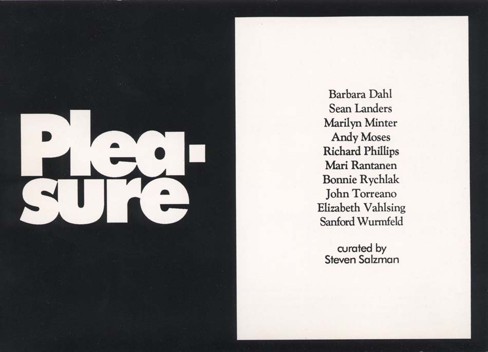 A visual arts exhibition curated by Steven Salzman featuring artists: Barbara Dahl; Sean Landers (FRENCH LADY, 1989; LAOCOON III, 1990); Marilyn Minter (ORAL MAKEUP #1 & #2, 1991); Andy Moses (SEA HITCHHIKER'S LONG JOURNEY, 1990; ALCHEMIST'S NOTES TO MODERN CHMISTRY, 1990); Richard Phillips (MORNING GOTH, 1989); Mari Rantanen (SWEET KEEPER, 1990; RELATIVE POSITIONS OF THE ESSENTIAL, 1990); Bonnie Rychlak (BEVERLY,1990; C.K.C. III, 1990); John Torreano (GOLD METAL, 1990; TUMBLE, 1991); Elizabeth Vahlsing (ONE-TWO-THREE, 1989; TIC-TAC-TOE, 1991); Sanford Wurmfeld (11-9(SEMI-SAT+N), 1988; 11-9 (YELLOW-WHITE), 1988).
