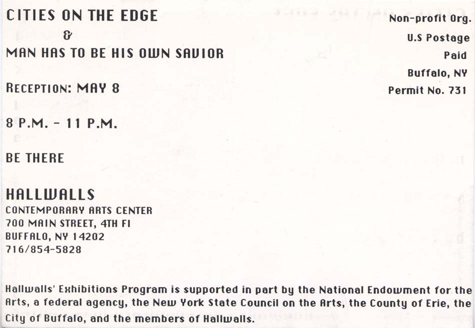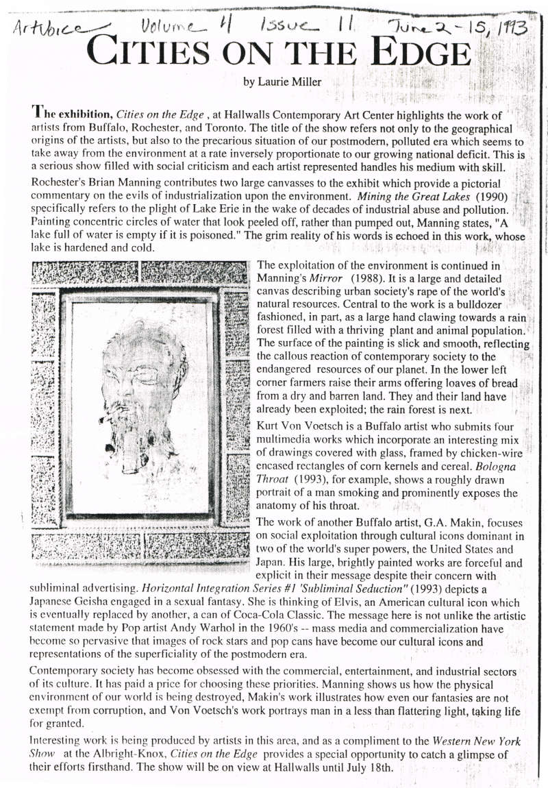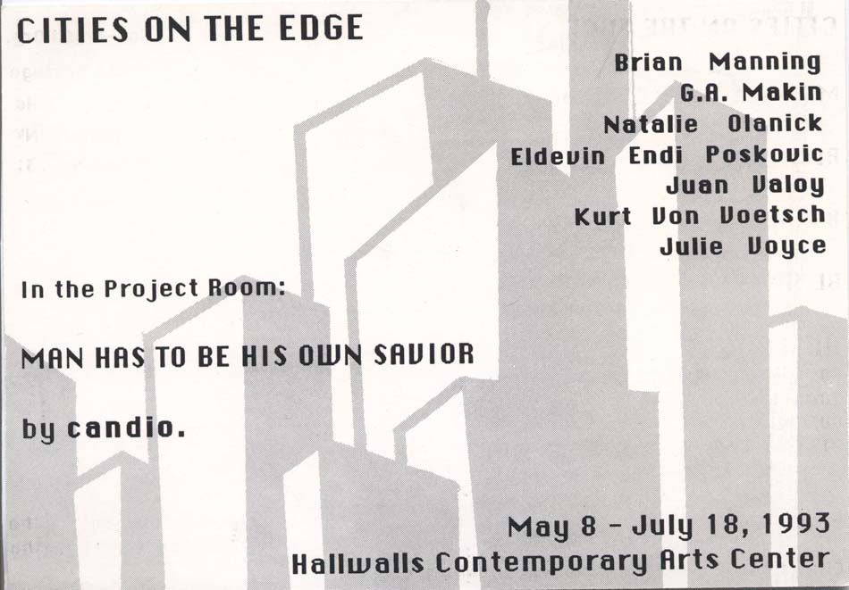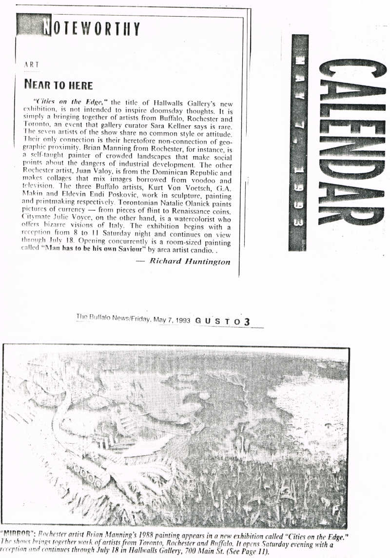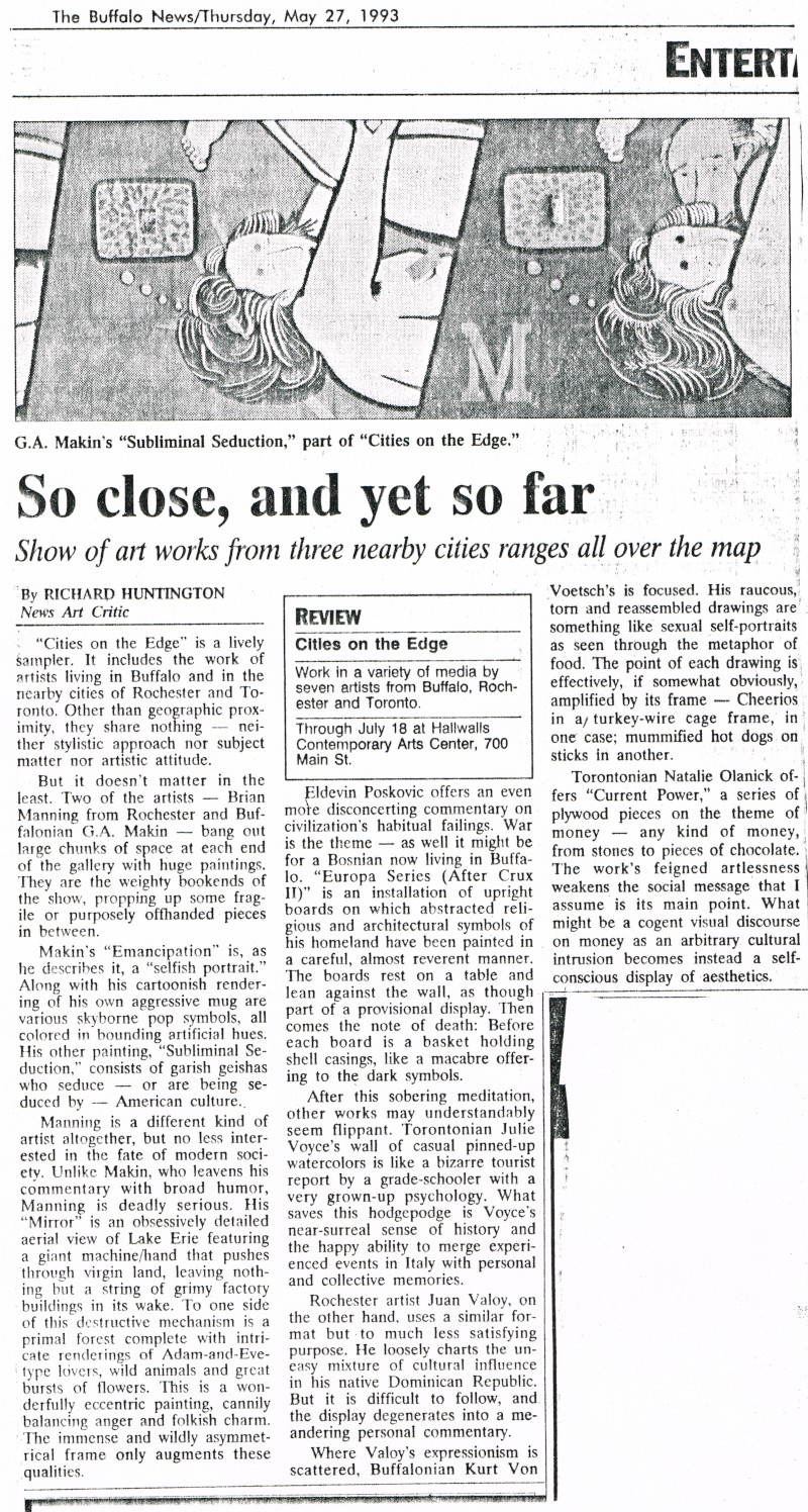 Intended as the beginning of a long-term commitment by the Exhibitions Program to present the Great Lakes region as an arts center, this group exhibition features G.A. Makin (Buffalo); Brian Manning (Rochester); Natalie Olanick (Toronto); Eldevin Endi Poskovic (Buffalo); Juan Valoy (Rochester); Kurt Von Voetsch (Buffalo); and Julie Voyce (Toronto). [CHECK for the "illustrated brochure" that the calander mentions for the names of pieces ]