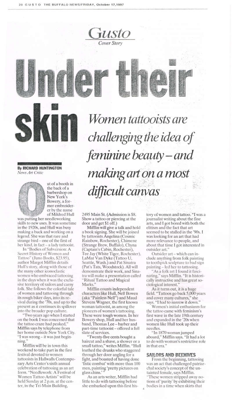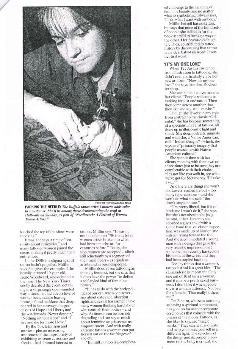 A tattoo festival with a focus on the art of tattoo and women. Featured artists include: Chimene (of Strange Brew, Buffalo, NY); Lamar Van Dyke (Seattle); Pat Sinatra (Pat's Tats, Woodstock, NY); and from Rochester, NY-- TJ (White Tiger), China (Captain's Cabin), Angelina (Cosmic Rainbow). Author Margot Mifflin reads from her new book BODIES OF SUBVERSION: THE SECRET HISTORY OF WOMEN AND TATTOO.