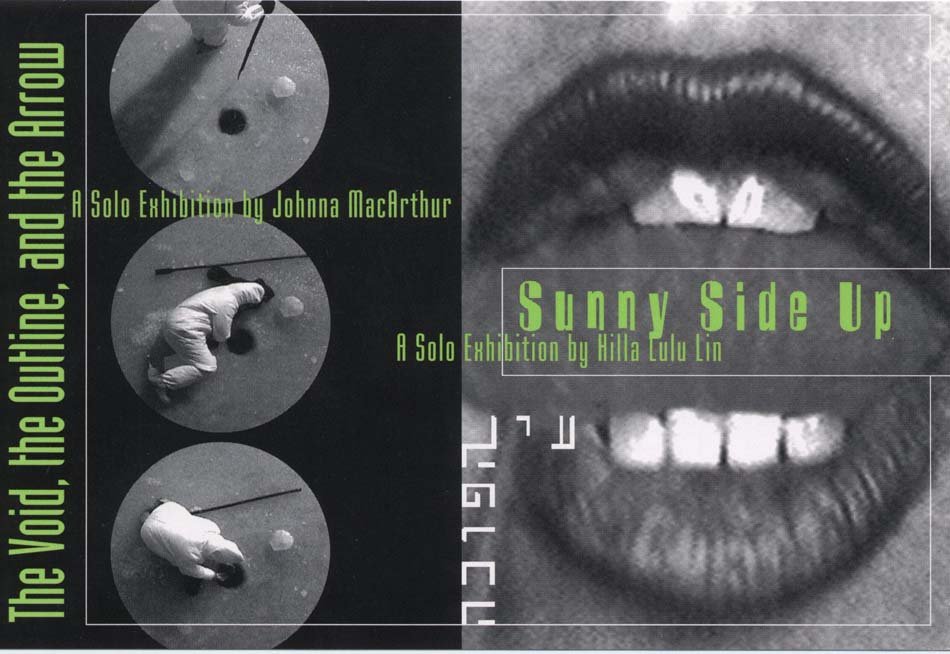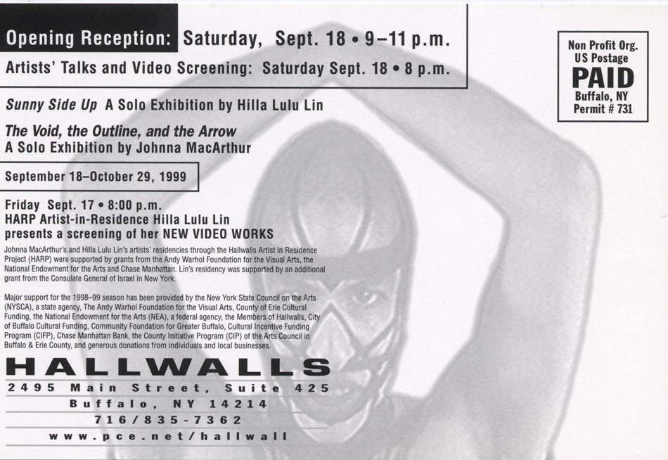A solo exhibition and video installation by Johnna MacArthur. Opening reception and artist's talk.[ARCHIVAL NOTE: The September 1999 printed calendar calls the installation by different name—The Arrow, the Plane, and the Void—and gives a different end date of November 5, 1999.]