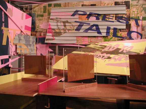 The projects undertaken by Bartow+Metzgar [Paul Bartow and Richard Metzgar] are arenas within which space is both created and disrupted. Theirs is a pointed exploration of “things in the world” and the the implications of rethinking things and structures as active agents. Using a simple set of algorithms or directives derived from certain known facts (size and shape of the gallery, its lighting track configuration, etc), B+M create an exploding assemblage whose unfolding growth highlights disparate and unexpected connections and relationships between objects and images. Elements of the urban environment (sound, signage, architecture) are reconfigured as the links and hybrids that invent new forms.