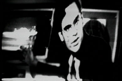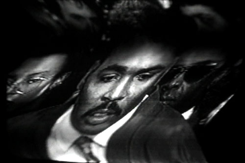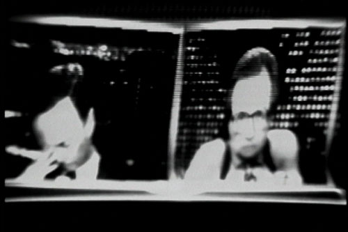 Disturbance resurrects scenes from the television coverage of the 1992 LA riots in an installation that explores the link between social disaster and television product. Recorded haphazardly by the artist at the time of original broadcast and rediscovered only years later, the images have been distorted and transformed through analog synthesizers and rendered into black and white (reminiscent of early television). Once-familiar images from our conflicted history, they have—through the short course of time—been made distant and alien, as though a stark and tragic transmission viewed from a far-off planet.