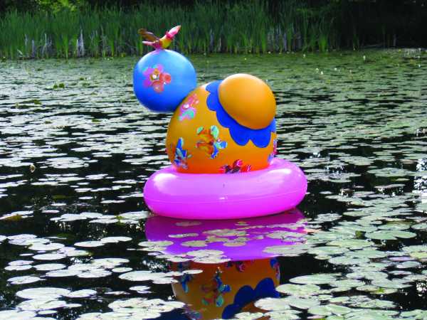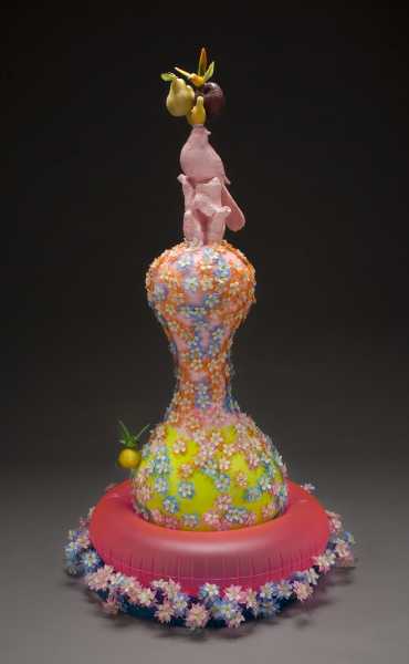 Roberley Bell's recent sculptural explorations spring from blobitecture, a current movement in architecture in which buildings adopt organic or ameoba-like forms in their structure. In previous works, Bell has used real flowers in real outdoor landscapes in an overtly unreal fashion, stylizing her topiary so specifically the real would appear artificial and the space between the real and unreal became ambiguous and undetermined. In her current Flower Blob works, she operates on a more intimate or human scale and works entirely with artificial components made to appear natural. It is not that Bell is attempting to convince the audience of the "naturalness" of her sculptures—plastic flowers, novelty birds, and dollar store components are clearly recognizable—but her methodology introduces an organic quality to the patently false. It is a sly cue to the history of human landscapes, reminding one of the overt control mankind has imposed on its environment. At the same time, Bell's artificial landscape—an intensely-controlled situation—remains expansive, open, and suggestive of innumerable potential horizons.