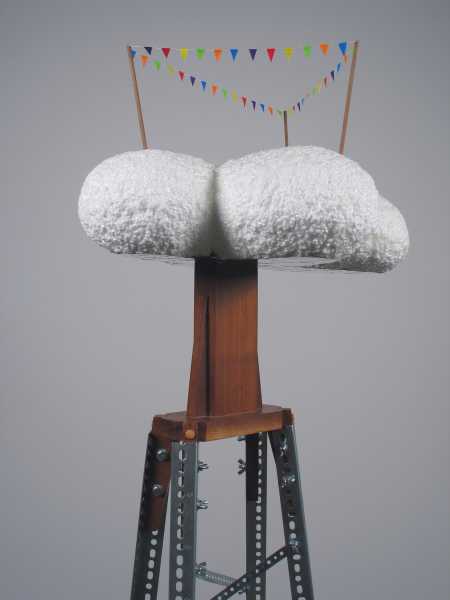 David Clayton's extrapolations on landscape and environment are connected more specifically than Bell to a sense of youthful aspirations and to a personal, romantic mythologizing around rites of passage. They are imbued with humor and optimism, even when these elements are pushed to their extremity. Thus, a cloud form crowned by the flags from a used car lot appears to contain some desultory or pathetic element, until we see it supported (propped up physically and exalted psychologically) by the addition of a wooden armature, which is itself supported by long, metal legs and topped (that is, bottomed) with plastic casters. It is klutzy, adolescent yearning cobbled together from sundry parts but it is tall, it exemplifies its own peculiar state of grace, and it is mobile—so it is simultaneously awkward and imbued with optimism. Clayton's works often appear housed in suitcases (a landscape on the go!), perched on shelves, or extended physically beyond their original form. They also reveal minute details or vignettes within a larger invented environment such that a single work will toy with aspects of macro and micro—smaller details take on added intensity while the larger form reiterates that these fantasy landscapes collapsing youthful desires are portable, movable feasts.