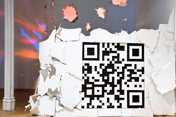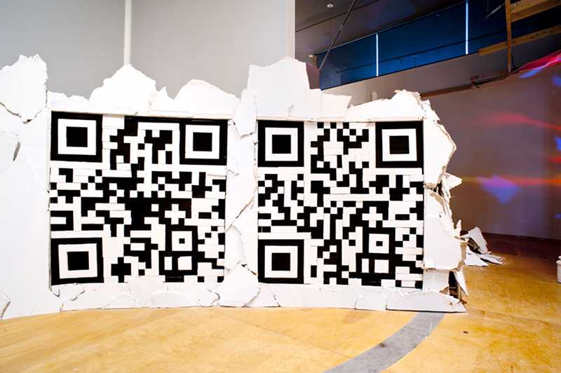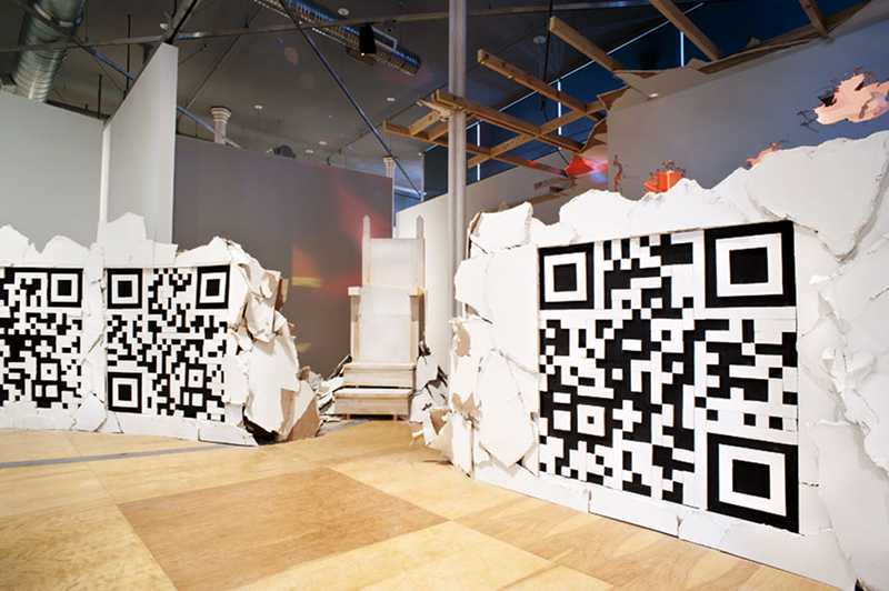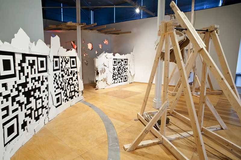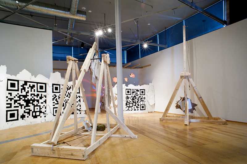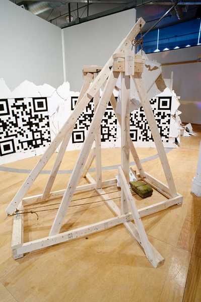 Key sculptural elements in the planned mis en scene will be a trebuchet, a gatehouse, a wall, a throne, and what at first appears to be walled ruins but on further inspection reveal themselves to be qr codes. QR codes are a visual matrix decipherable by barcode readers and, more recently, smart phone bar code apps. Whereas Bosworth has in the past often created entirely immersive image-based environments using old negatives, film projections, and handmade projectors, his plans for the current project are centered upon an immersive sculptural landscape, within which images are embedded and hiding in plain sight.