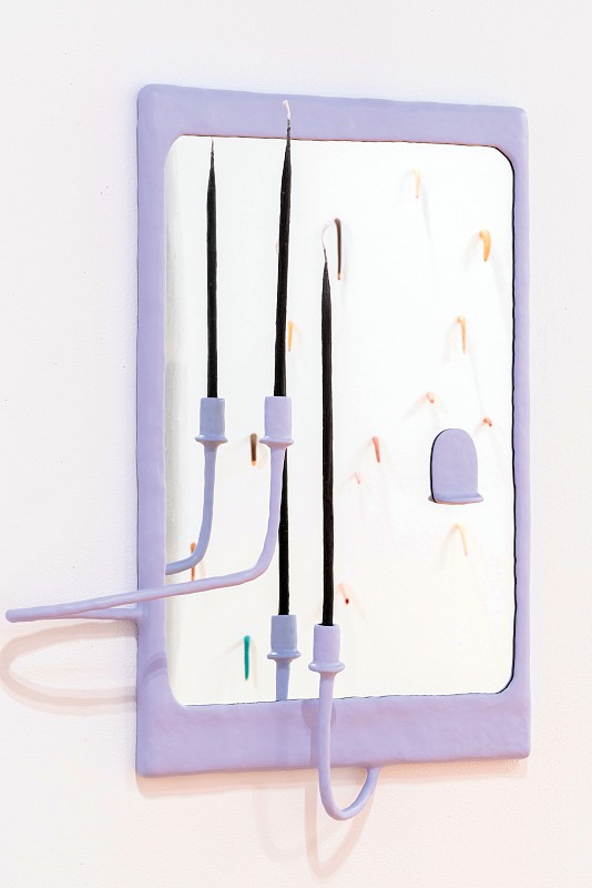 The works are a combination of traditional materials—wood, clay, epoxy clay, paint, steel, copper) and found objects, with the frequent incorporation of shifting materials such as candles, scents, food, or living plants. These temporal elements introduce a deep humanism to the works, as they change and transform over time—growing, wilting, degrading—in a way that denies their complete articulation as commodified art objects. This quixotic animation of the works adds another layer to their sense of self.