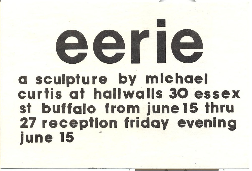 Michael Curtis (EERIE, a sculpture); Patricia Mergi (MOSS CARPET); Andy Topolski and Don Metz (RED, Intermedia presentation with E.B.M.A.) Two-week exhibitions, one artist/room.