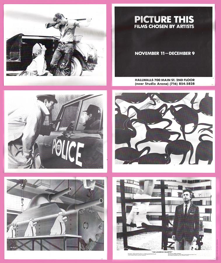 Film series poster design by Louise Lawler (with Paul Szpakowski), 1986. The poster (21.5 x 25.75 inches) is based on "A Movie Will Be Shown Without The Picture," Lawler's contribution to the accompanying 108-page Hallwalls book publication PICTURE THIS: FILMS CHOSEN BY ARTISTS (1987), edited by Steve Gallagher, pages 63–69. On its front and back, the poster reproduces 5 of the 11 film stills Lawler chose for her visual essay in the book, which includes stills from Giant, Alphaville (also one of two films chosen by Barbara Bloom, pages 9–13), Rear Window, The 5,000 Fingers of Dr. T., Defense Against Invasion (a 1943 war-propaganda-style pro-vaccination film produced by Disney), Blade Runner, and Pinocchio. In addition, the front of the poster includes (bottom right) a still from Radley Metzger's The Lickerish Quartet (1970), the subject of Dan Graham's contribution to the book, pages 58–62. (Scans by Paul Szpakowski from his copy of the original printed poster, February 2013.)