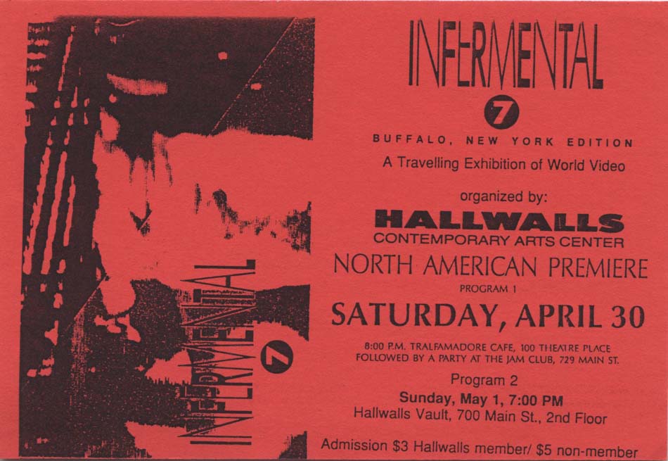 North American premier screenings of INFERMENTAL 7, an international media exhibition, featuring the work of 58 artists from Eastern and Western Europe, North and South America, Japan, Australia and New Zealand — and Buffalo. Organized in Buffalo by Chris Hill, Tony Conrad, Peter Weibel, and Rotraut Pape. The two programs, a total running time of five hours, are organized around five broad categories. The works include both artist videos and segments from public access television, regular television programming, home videos, and commercials. Both programs are available for viewing in the Video Viewing Room daily, and can be rented as a VHS by members. They will also be screened on Artwaves in September and October.