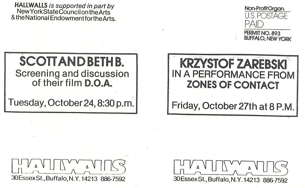 Featuring the works of Beth B and Scott B. [Note: Video documentation of this event is in the Hallwalls archive at the Poetry Collection, a special collecton of the State University of New York at Buffalo Libraries. To learn more about what Hallwalls is doing to make this analog material digtialy accessible, please visit Migrating Media, our collaboration with Squeaky Wheel, Burchfield Penney Art Center, and the Experimental Television Center.]