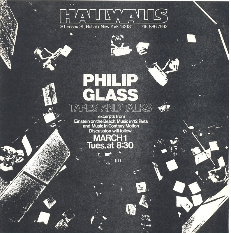 Presentation of audiotapes and discussion with the composer. Glass will play excerpts from EINSTEIN ON THE BEACH; MUSIC IN 12 PARTS; and MUSIC IN CONTRARY MOTION, followed by a discussion.