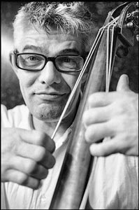 Wilbert de Joode is a veritable research scientist of bass pizzicato and bowing techniques. A self-taught musician, he has been playing the double-bass since1982. He began working in groups that improvised within a jazz framework. His idiosyncratic style was soon noticed and in the mid 80's he played in groups led by Vera Vingerhoeds, Armando Cairo and Ig Henneman where he further developed his improvisation skills. During this period he was constantly in demand to accompany conservatorium students in their final exams. He came into contact with such musicians as J.C.Tans en Rinus Groeneveld, Michiel Braam, Han Bennink en Han Buhrs (Schismatics). In 1990 Ab Baars recognized the progression in de Joode's playing and invited him to join the Ab Baars Trio.