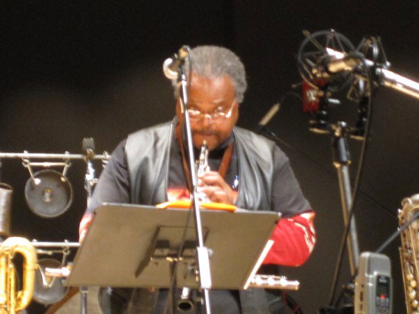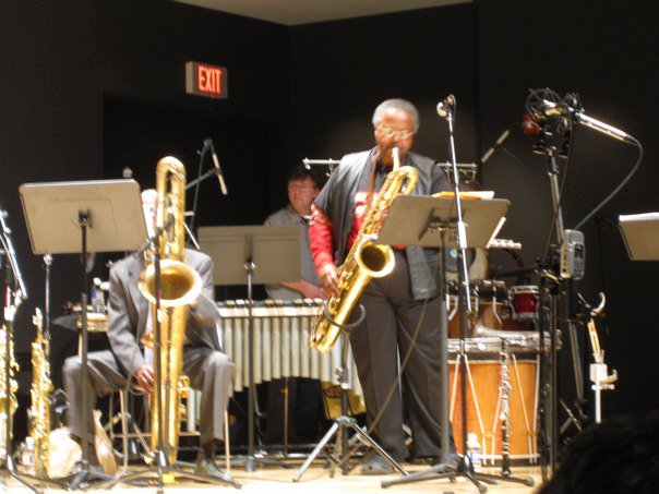 (Bottom photo, right: Rosco Mitchell seated playing bass saxophone, John Bacon on percussion, Rey Scott on bari sax, at BPAC auditorium, October 22, 2010.)