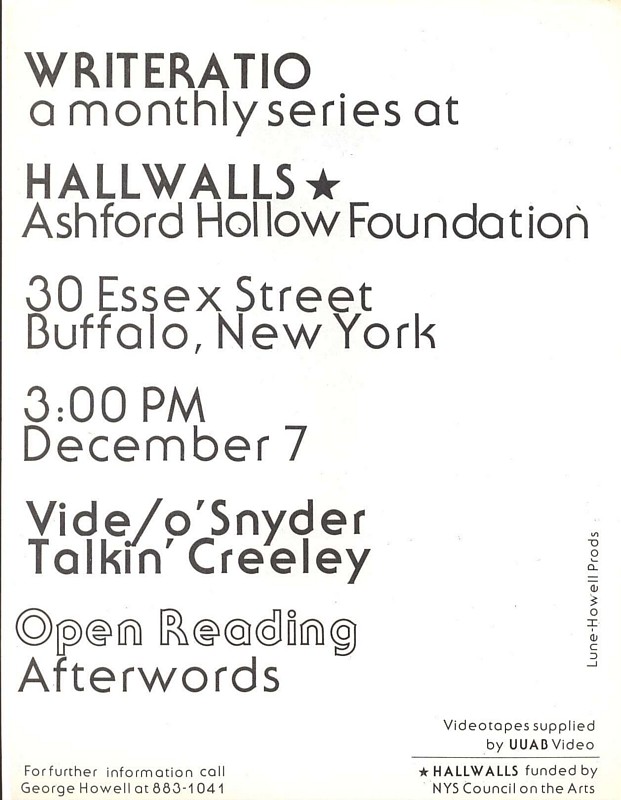 Reading series and video screening featuring: Gary O'Snyder (video), Robert Creeley (talk)