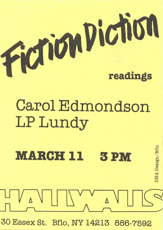 Features: Carol Edmondson, and L.P. Lundy [NOTE: Audio documentation of this event is in Hallwalls archive at the Poetry Collection, a special collection of the State University of New York at Buffalo Libraries.]