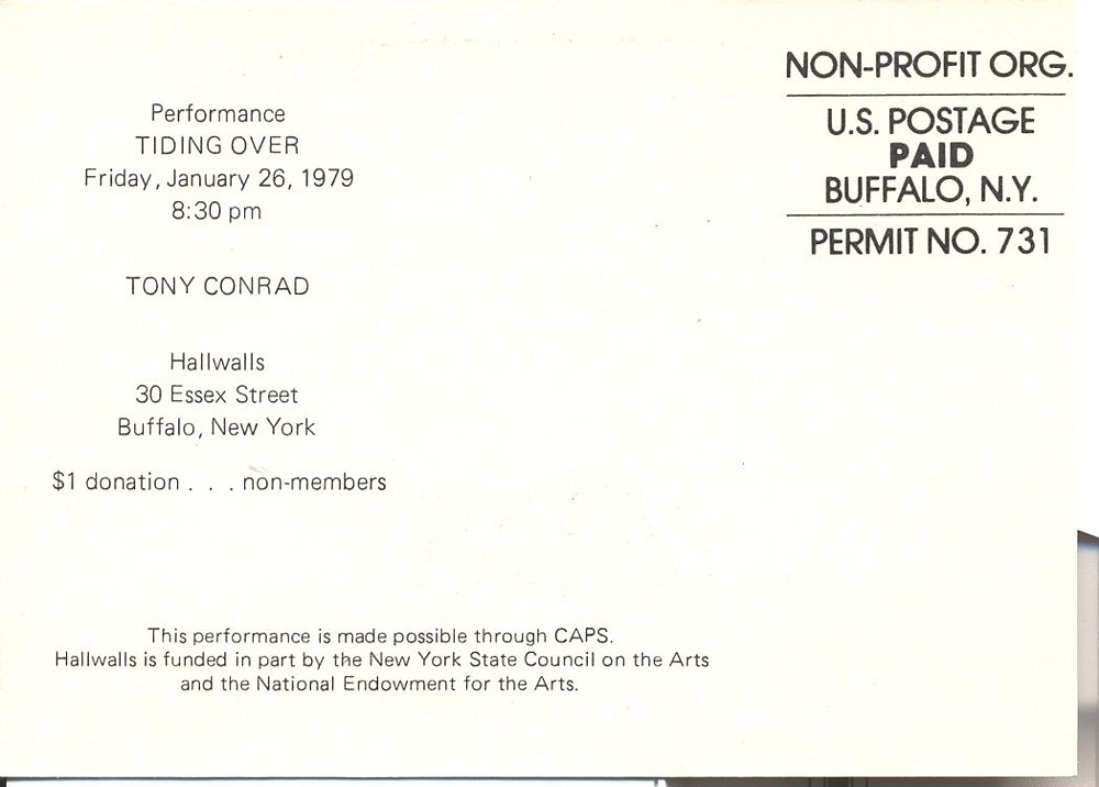 "Here's another data point: The archive listing for Tony's performance of Tiding Over at Artspace in Peterborough on April 25 of that year says it featured 'slides and sounds,' and was 'First presented at the Kitchen Center, New York City, December 29, 1977.' About 2 weeks before the Kitchen performance, on Dec. 13, he is listed as doing a performance at Hallwalls as part of the 'Continuing Retrospective Series.' No further details are provided, but I wonder if that was what became Tiding Over when he performed it at The Kitchen."