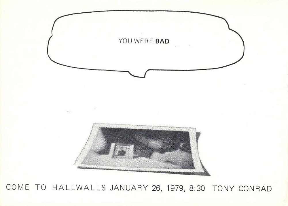As far as we can make out from the new meticulously dated audio files recently released on Music and the Mind of the World, Tony Conrad played (and recorded himself playing) piano every day at Hallwalls from January 15–February 5, with the exception of the nine days January 26–February 4, and this performance took place on Friday, January 26th. Were the 10 days leading up to this performance rehearsal for it, or was the performance something completely different?