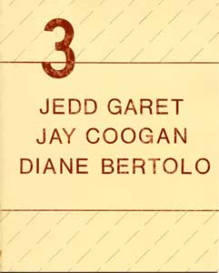 3: JEDD GARET JAY COOGAN DIANE BERTOLO. Hallwalls Inc, NY, 1981. [A twenty-four page booklet produced in conjunction with the three solo exhibitions of Jedd Garet, Jay Coogan, and Diane Bertolo. Catalogue includes an introduction by the exhibit's curator, G. Roger Denson, as well as a description of each artist, prints and photographs of their work in both black and white and color. The booklet was designed by G. Roger Denson.}