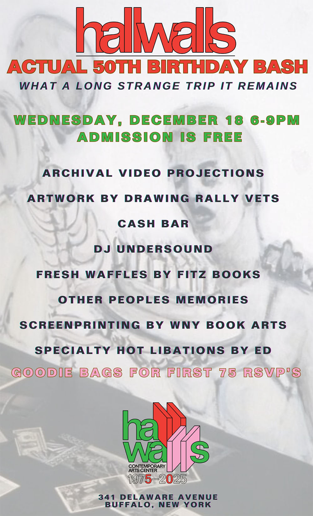 Although we are celebrating our 50th anniversary all season long (July 12, 2024–June 22, 2025), Wednesday DECEMBER 18, 2024 is our actual 50th birthday, because the very first event under the Hallwalls name, the first event starting the clock on our 50-year Timeline (which now lists over 6,600 events!), took place on DECEMBER 18, 1974, at Buff State: