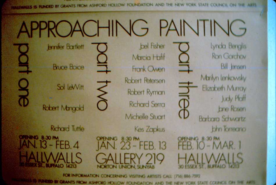 Exhibition of 2-dimensional works by Joel Fisher; Marcia Hafif; Frank Owen; Robert Petersen; Robert Ryman; Richard Serra; Michelle Stuart; and Kes Zapkus. Coordinated [curated] by Hallwalls Co-Director Charles Clough. Due to size limitations, Richard Serra's "Willis Avenue" is on view at 30 Essex St. [Photos of its installation at 30 Essex St. are shown on this page. Charlie Clough is on the ladder.]