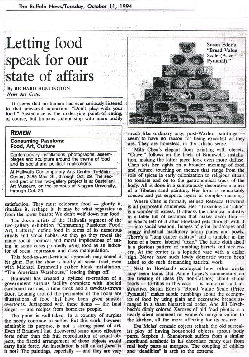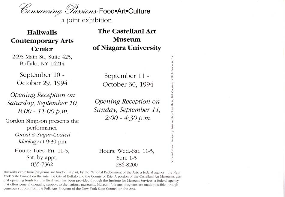 A collaborative, two-site, exhibition bringing together folk artists and contemporary artists to examine food. The Hallwalls site includes THE AMERICAN WAREHOUSE (Michael Bramwell, reconstructed USDA food boxes and the recipes of homeless people); CRAVE (Millie Chen, spices and terracotta spoons), TOXICOLOGICAL TABLE (Rebecca Howland), works by Susan Eder; Eva Melas; Sarah E. Webb; Annie Lopez; Stephen J. Shanabrook (chocolate castings of wounds); Christina Daphne Tryforos; Jill M. Birschbach; Ted Gibson; and Gordon Simpson. Gordon Simpson will perform CEREAL AND SUGAR COATED IDEOLOGY on the night of the opening. Exhibition is accompanied by an illustrated catalogue with essays by Sara Kellner, Elizabeth Licata, and Kate Koperski.