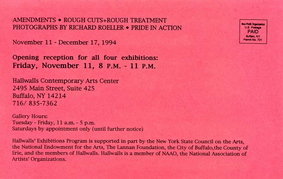 AMENDMENTS: Exhibition curated by Sara Kellner focusing on artists navigating personal identity through politicized issues such as sexuality, AIDS, and civil rights. Artists include Gaye Chan (an altered US NAVY flag); Elliot Linwood (multimedia installations using bees and hair); E.A. Racette; Jo Ann Brenner (ceramics); Don Bell (drawings); DYKE ACTION MACHINE! (aka Carrie Moyer and Sue Schaffner, art and posters); Robert Windrum (embroidery); Louise Deidrich (3-D drawings of Linda Blair); Kenneth Sean Golden (A QUEER KIND OF HOUSE, paper construction); HUMANE SOCIETY (Ricardo Zuleta, photographic documentation of performance); Eli Langer (drawings); and Joy Episalla (photocopies). [NOTE: "Eli Langer, a talented and serious young Canadian artist whose drawings were to have appeared in the AMENDMENTS show, decides on advice of counsel to withdraw the work, fearing it might hurt his case now pending in the Canadian courts. His attempt to sue for return of his paintings confiscated from a Toronto gallery — seized on charges of child pornography — is a nationally celebrated test case of Canada's harsh new censorship laws. — E.C.]