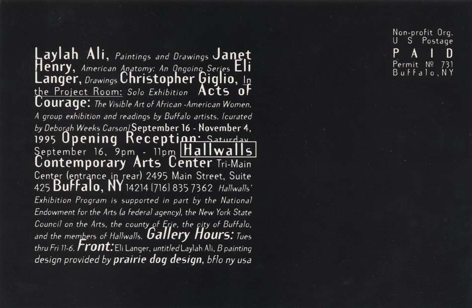 Four solo exhibitions of works by Laylah Ali, Janet Henry, Eli Langer, and Christopher Giglio, featuring: paintings and drawings by Laylah Ali; AMERICAN ANATOMY: An Ongoing Series by Janet Henry; drawings by Eli Langer (of Toronto, in his first exhibition in the United States); and In The Project Room: an exploration of technologically-derived imagery by Christopher Gigilo. (See also September 16, 1995).