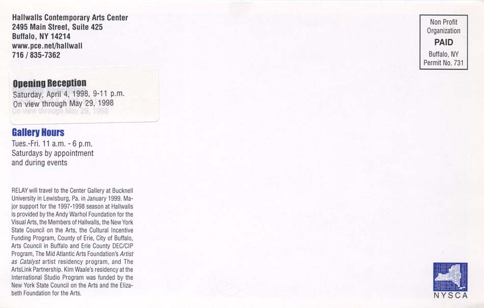 Gallery exhibition curated by Sara Kellner and Stuart Horodner featuring works by artists: Luca Buvoli (NOT A SUPER HERO; CAN'T YOU SEE THAT I'M BURNING?); Charles Goldman; Johnna MacArthur (GET ON WITH IT, WILL YOU?); Gerhard Mayer; Francois Morelli (IS BIOLOGY AN OUTMODED CONCEPT?); Joyce Pensato (HALLWALLS DONALD); Mark Dean Veca (SON OF GUMMI GROTTO); Sean Watson (YOU CAN ALWAYS TELL A WATSON BY THE NOSE); Yukinori Yanagi (WANDERING POSITION). RELAY travels to Bucknell University Center Gallery in January 1999.