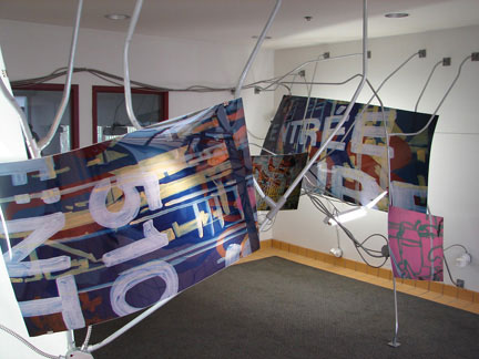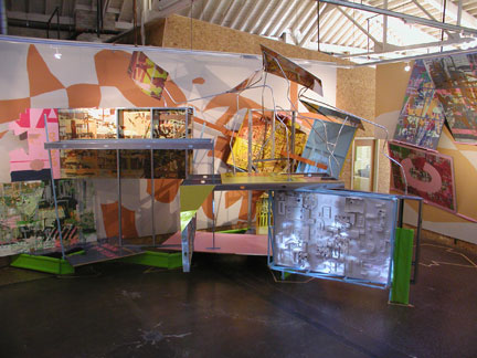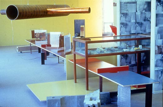 The projects undertaken by Bartow+Metzgar [Paul Bartow and Richard Metzgar] are arenas within which space is both created and disrupted. Theirs is a pointed exploration of “things in the world” and the the implications of rethinking things and structures as active agents. Using a simple set of algorithms or directives derived from certain known facts (size and shape of the gallery, its lighting track configuration, etc), B+M create an exploding assemblage whose unfolding growth highlights disparate and unexpected connections and relationships between objects and images. Elements of the urban environment (sound, signage, architecture) are reconfigured as the links and hybrids that invent new forms.