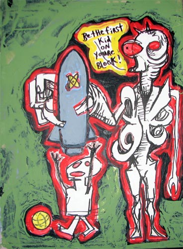 Chris McGee—who has dubbed his own practice “doodleglyphics”— combines drawing, painting and collage into a personal mythology of symbols and characters. Like Brill’s work, McGee’s appears in a constant state of transformation and mutation. Often realized on rough, untreated surfaces, McGee’s works play off an intentionally primitive aspect, but their psychological depth is entirely contemporary. Cynical allusions to technology (and technological offspring, like contemporary warfare) are a persistent theme throughout McGee’s work.