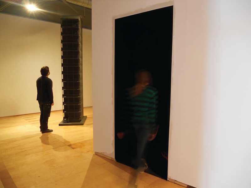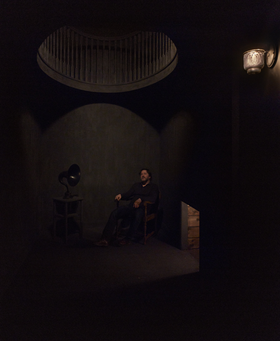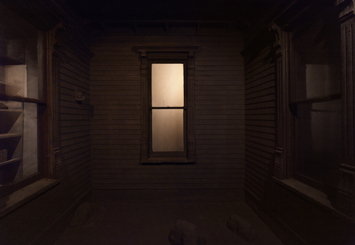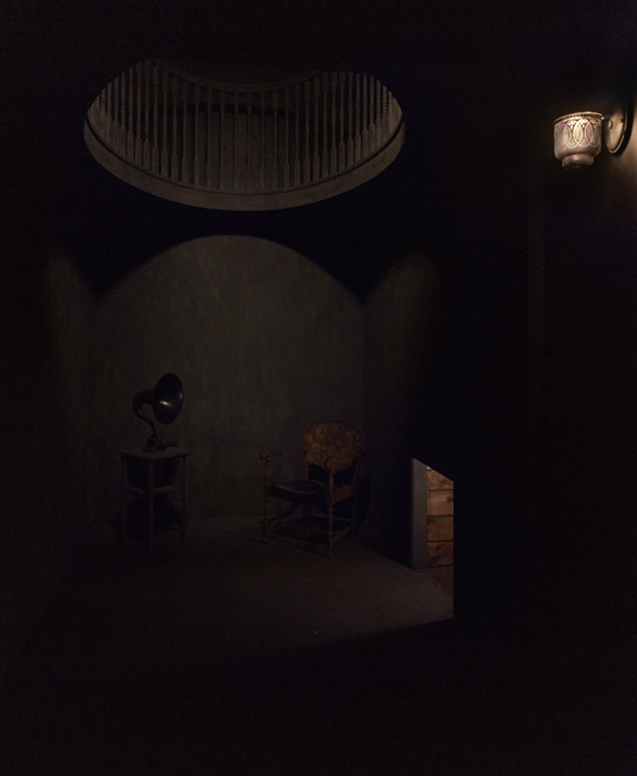 This enclosed and directed space concocts its own claustrophobia through its configuration, its material nature, and its controlled lighting. Intimate, with a darkness that requires our eyes to adjust, there is a subtle but pervasive sense that we are exploring, or intruding upon, a personal space that has recently been occupied or may be occupied again soon. While its psychological terrain is expansive, the work creates this effect within a relatively modest physical footprint. Windows and portals are in evidence, but perspective is tightly managed. As if to underscore what we will never know or resolve about the space and the emotions it stirs up, a ceiling balustrade hints at a space above us through its expansive portal, but gives us no more than a tantalizing suggestion of wider possibilities. In the same room, a dimly lit tunnel at floor level suggests something else to discover through a quality that is half lure and half dare. Camouflaged in the nearby corner, an old speaker horn transmits ambiguous bits of old sermonizing, like a looped memory—not specific enough to articulate a narrative, but ever present throughout the close confines of the piece and fuel its anxious atmosphere.