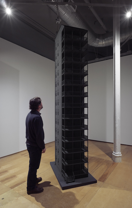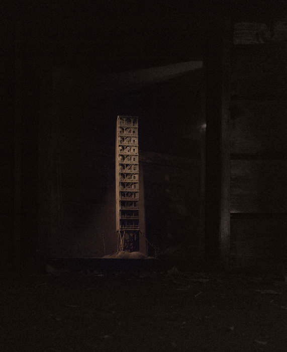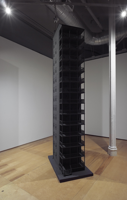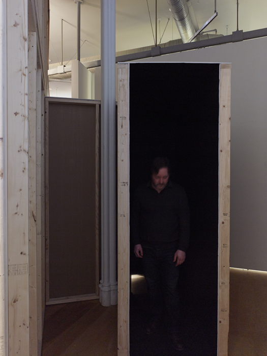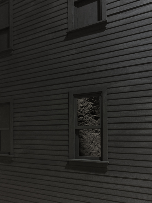 In combination with the larger installation, Robideau also includes architectural models—at different scales and with their own specific interior sight lines—that refer to and play against the larger construction. Models, because they are diminutive representations of that which we know, often contain a quaintly cute aura. Robideau's models are, in their own way, as striking as the larger work that engulfs us. Materially and psychologically, they seem to be appendages of the larger scene, repeating its sightlines, its darkness, and its ambiguity. Standing outside a model, we might presume to encounter greater clarity but Robideau keeps them effectively vague and inaccessible. In playing with various scales, it also becomes a question not merely of what work we are looking at, but what work we might be inside.