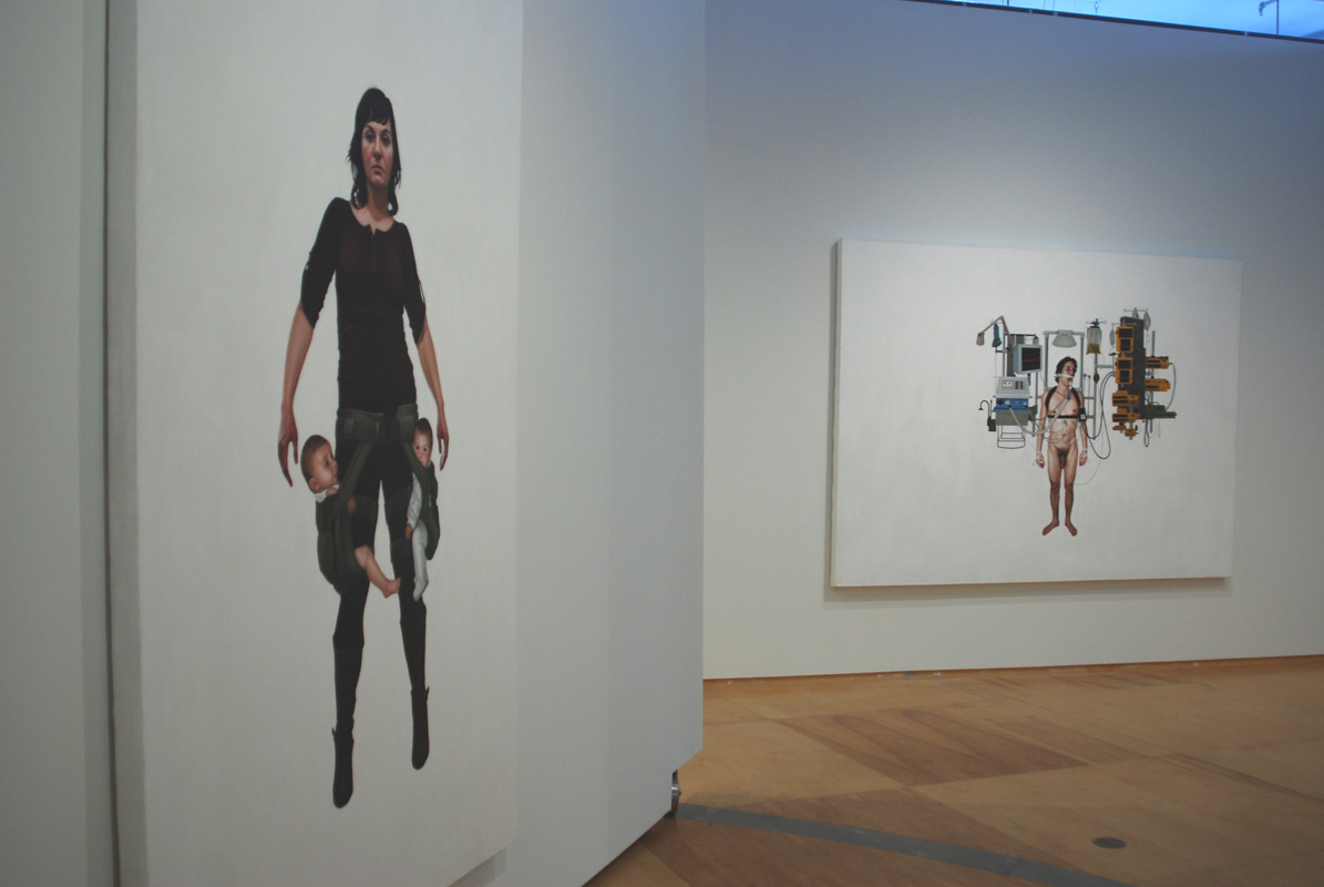 It’s a swagger not shared by everyone. Seeley paints himself in a frighteningly naked portrait, attached to a hovering pile of medical equipment, helpless, with a glazed over, near-deathly look on his face. Some of the equipment advertises “constant care” while digital readouts seem to evoke birth and death dates. Seeley’s isolated white background here operates as an antiseptic zone of abject fear. It’s one of many gigantic parental nightmares, illness so substantial one is unable to care for one’s family.